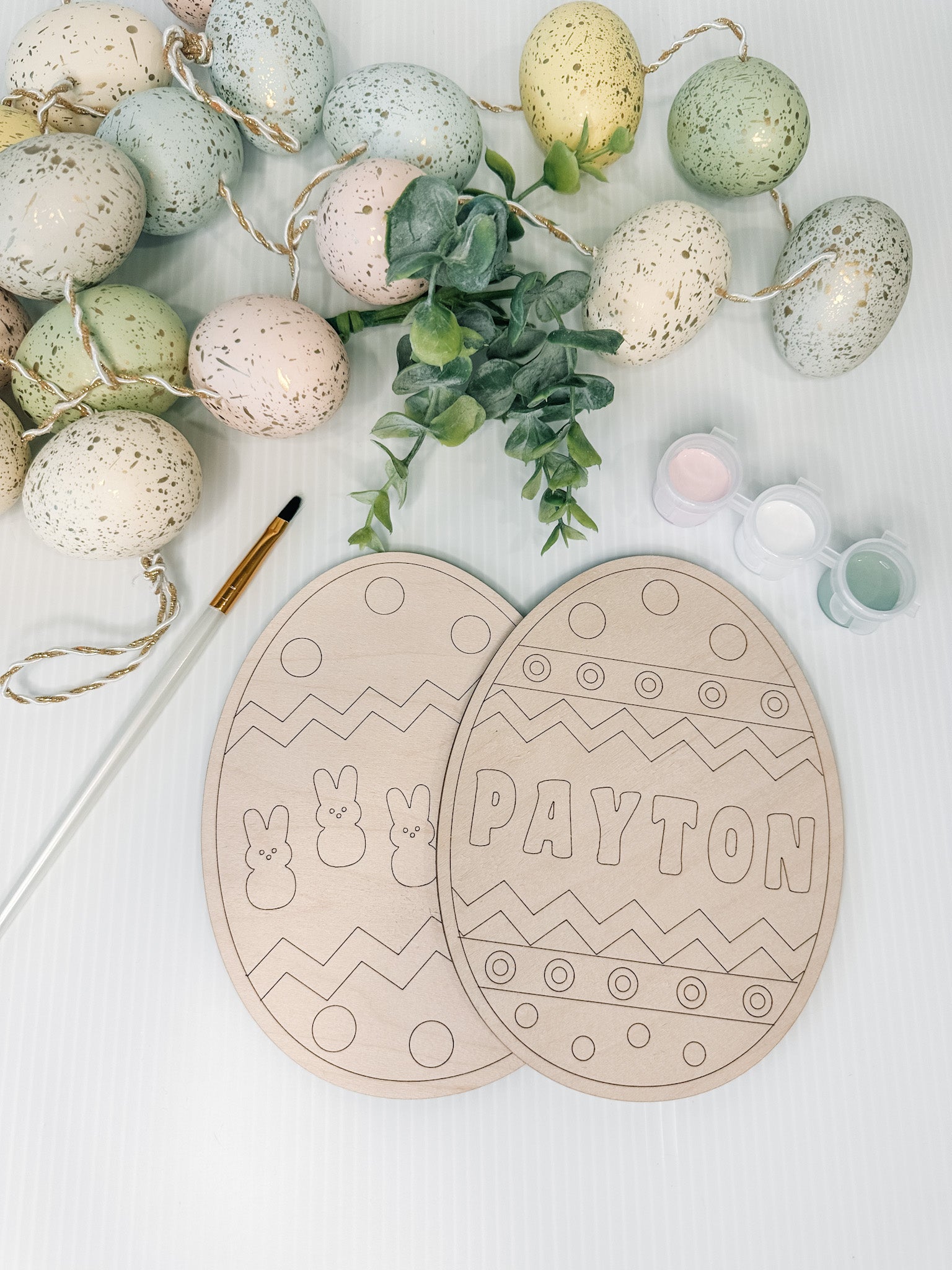 Each kit comes with a paintbrush, three paint colors, and 2 wooden eggs (one personalized with child's name).