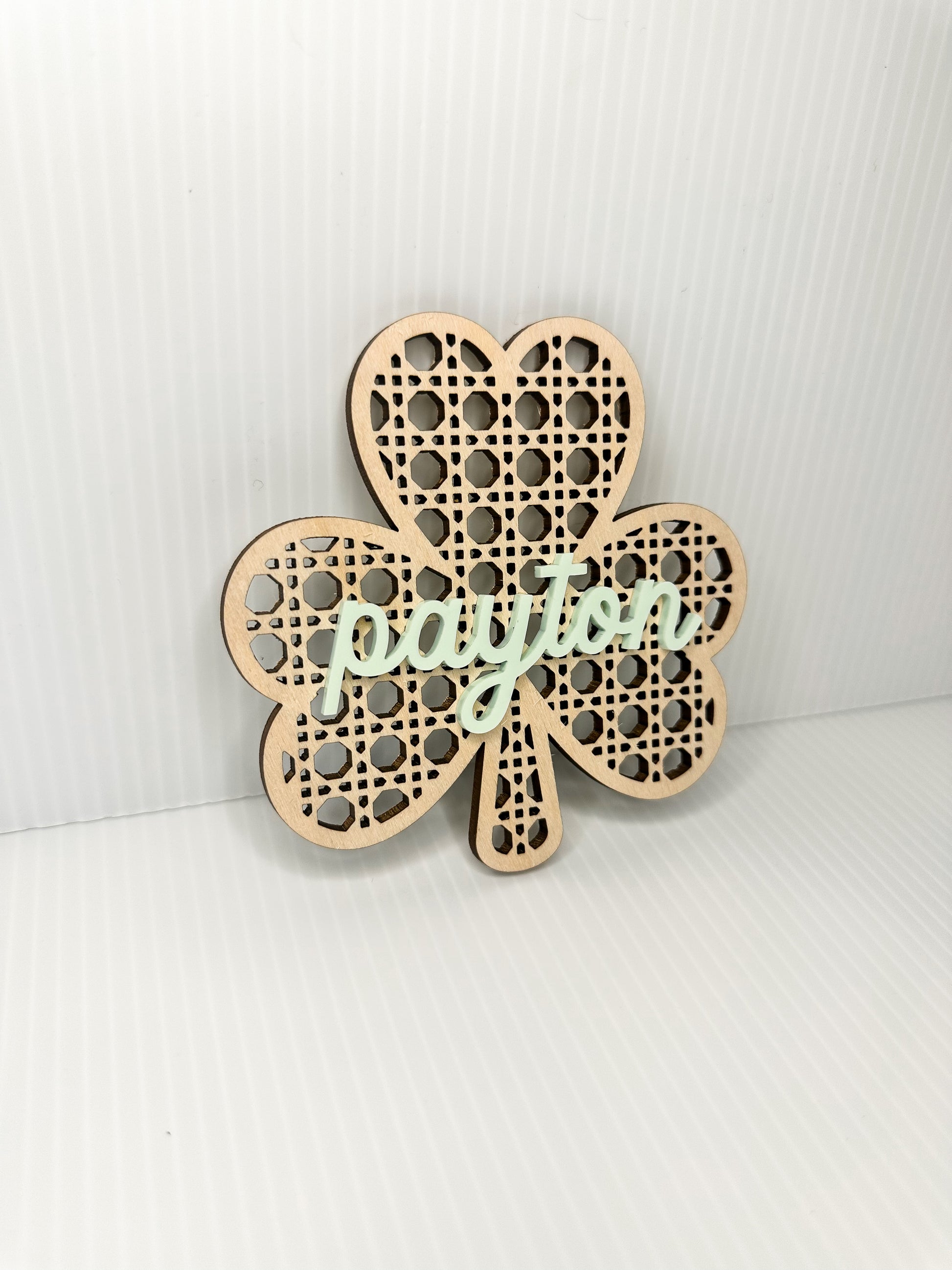 Wood, rattan patterned tag with Pistachio Green acrylic name.